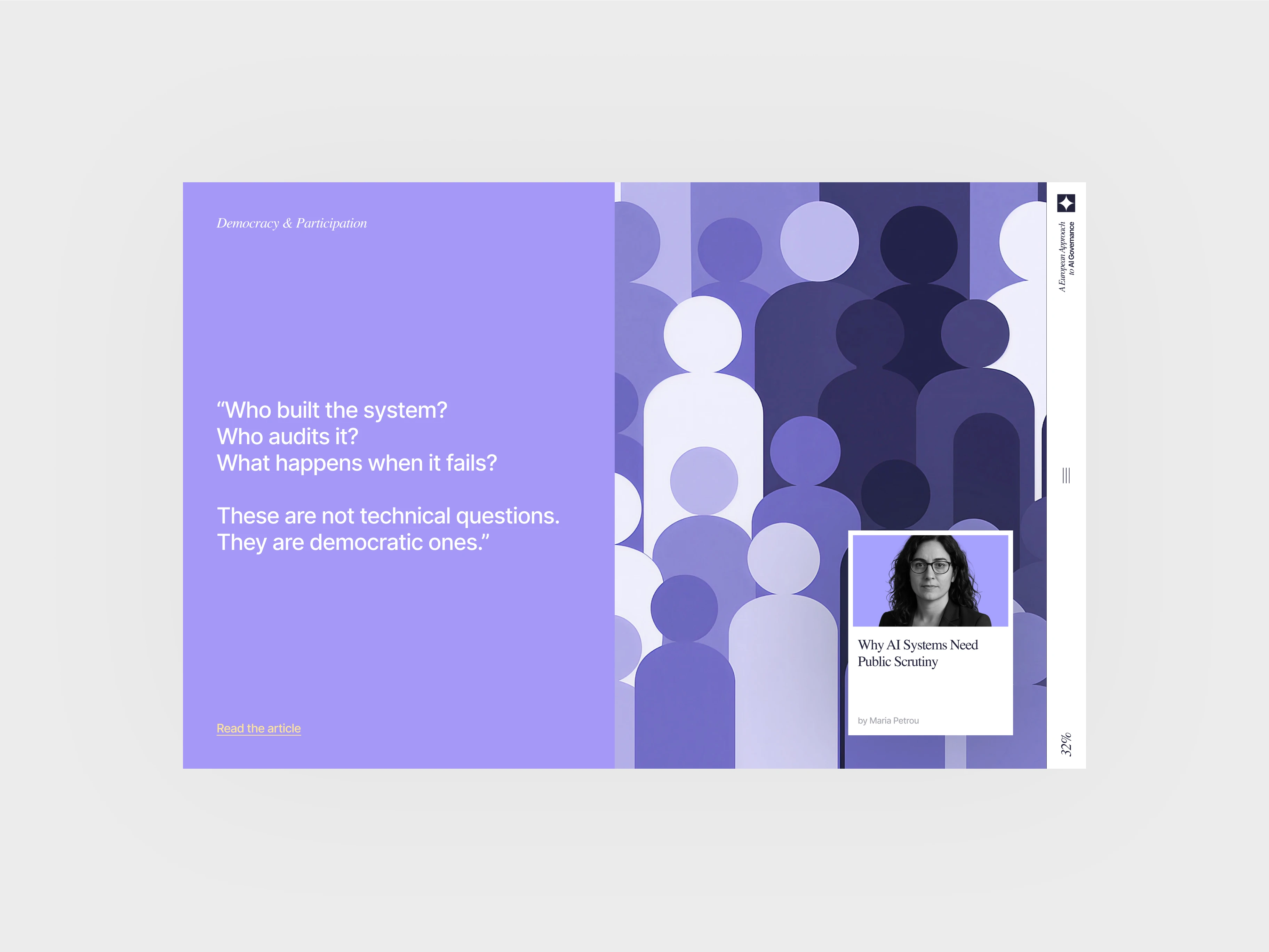 This interactive report explores how design can frame Europe’s role in shaping AI governance through values like democracy, transparency, and the common good. The publication combines a refined editorial layout with calm, gradient-based visuals and accessible typography to convey authority without rigidity. Its structure and motion guide readers through expert insights and policy reflections, turning a dense policy topic into an engaging digital narrative.